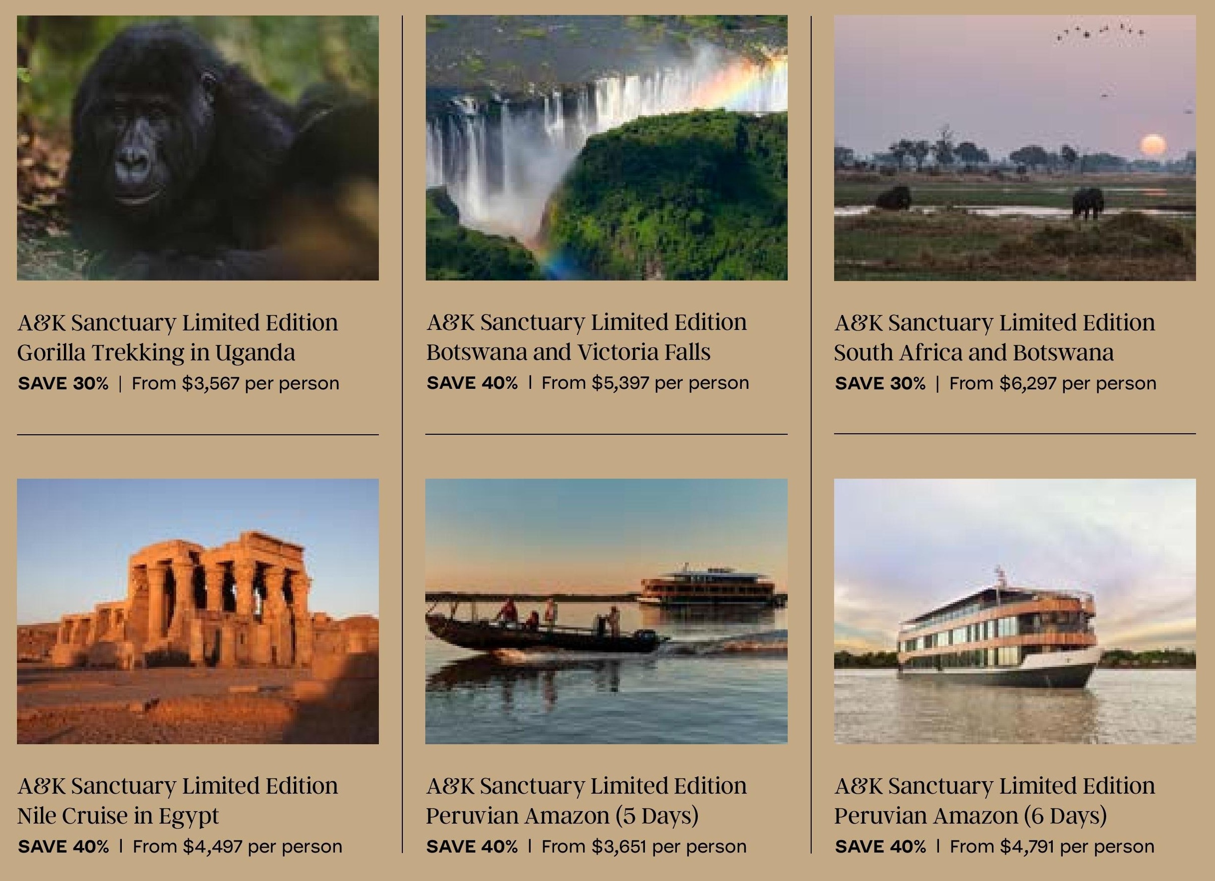 Running from October 8 to 22, our Wild October sale offers your clients the chance to experience a selection of nine A&K Sanctuary Limited Edition journeys, including safaris in Kenya, Tanzania, and Botswana, a gorilla-trekking adventure in Uganda, and superlative river cruises in the Peruvian Amazon and on the Nile.